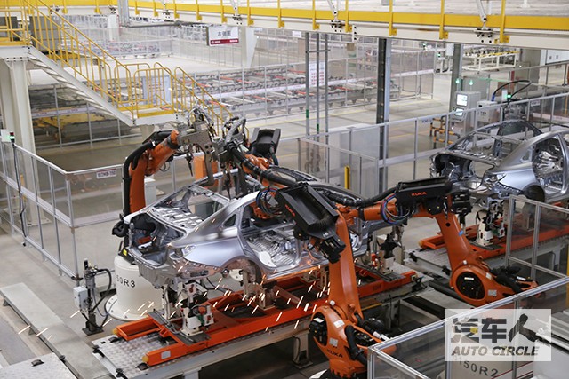 焊裝車間,175臺德國KUKA機器人集體操作,在線激光測量設備ACS、機器人抓件視覺引導系統更提升了焊接的精準度。涂裝車間和總裝車間均采用越級的標準,不論是供應商還是設備,抑或是技術標準幾乎與北京奔馳一致。